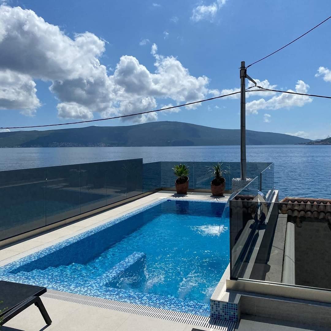 The villa is a two storey building and consists of three bedrooms with french beds, spacious living room, kitchen with a dining area, two bathrooms. The villa is fully furnished and ready for comfortable living, including: LCD TV, Wi-Fi, air conditioners, smart home system, security system. The villa is located on the beachfront in the city of Tivat. It is modern complex "Porto Montengro" not far away from the villa. There is a private swiming pool, beach platform, garden and barbecue on the territory of villa. Maximum occupancy is 8 people (it is possible to put two extra beds in the living room).