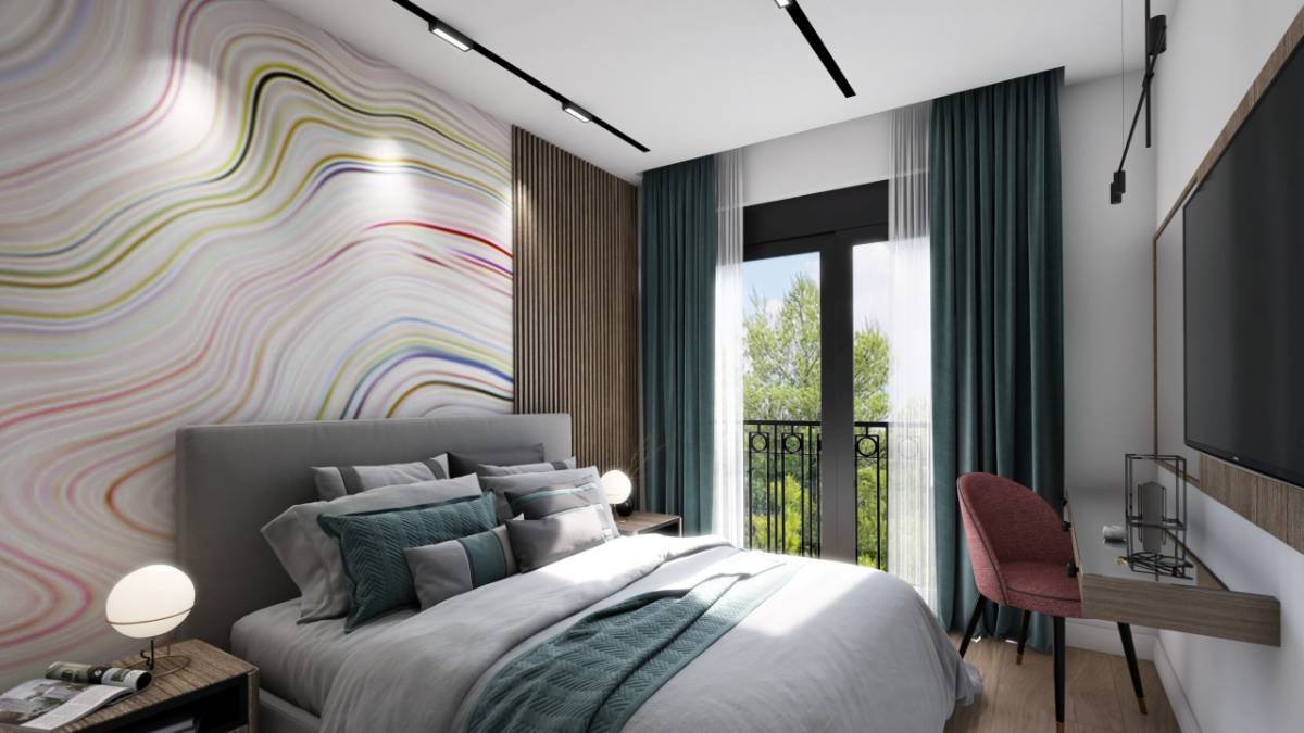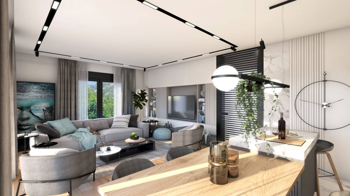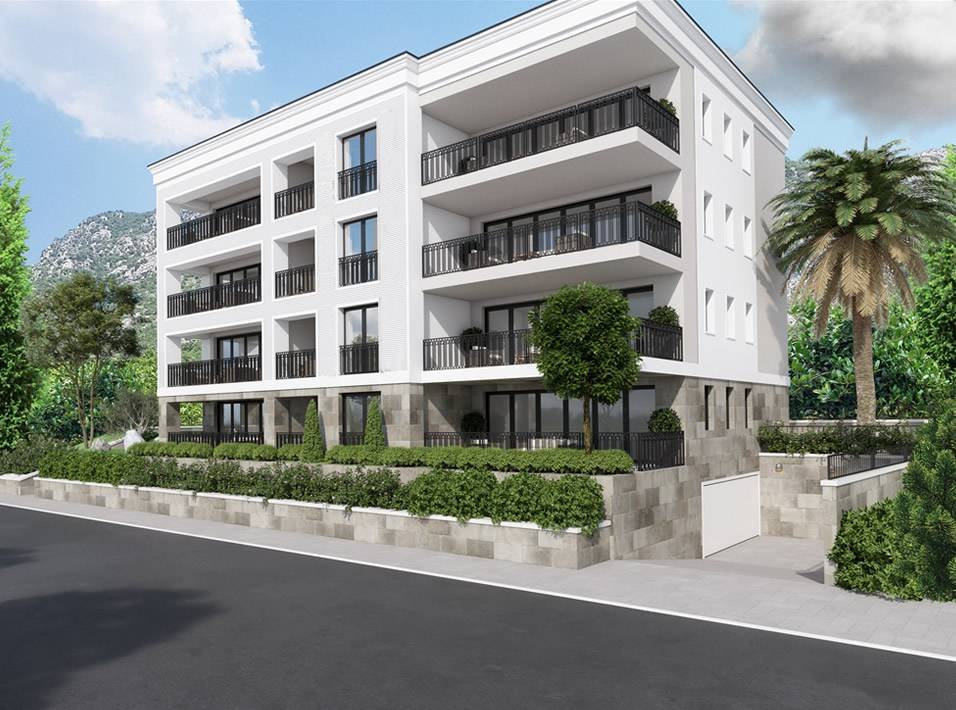 Two-bedroom apartment in a new building in Kumbor The area of 91 m2 consists of 2 bedrooms, living room with kitchenette, 2 bathrooms and a terrace. Located opposite the Portonovi complex. A high-quality building made of natural stone, panoramic windows, landscaping. Completion end of 2023