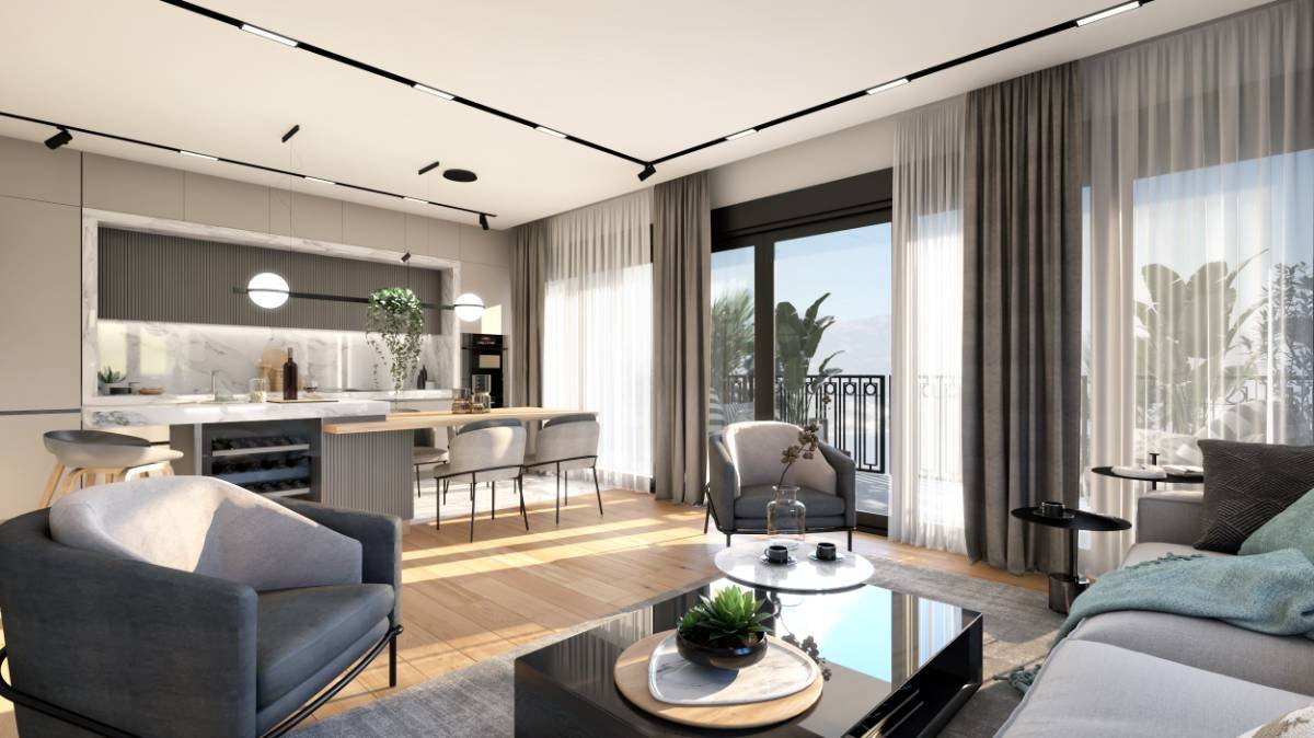 Two-bedroom apartment in a new building in Kumbor The area of 91 m2 consists of 2 bedrooms, living room with kitchenette, 2 bathrooms and a terrace. Located opposite the Portonovi complex. A high-quality building made of natural stone, panoramic windows, landscaping. Completion end of 2023