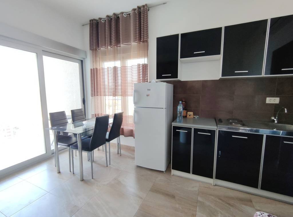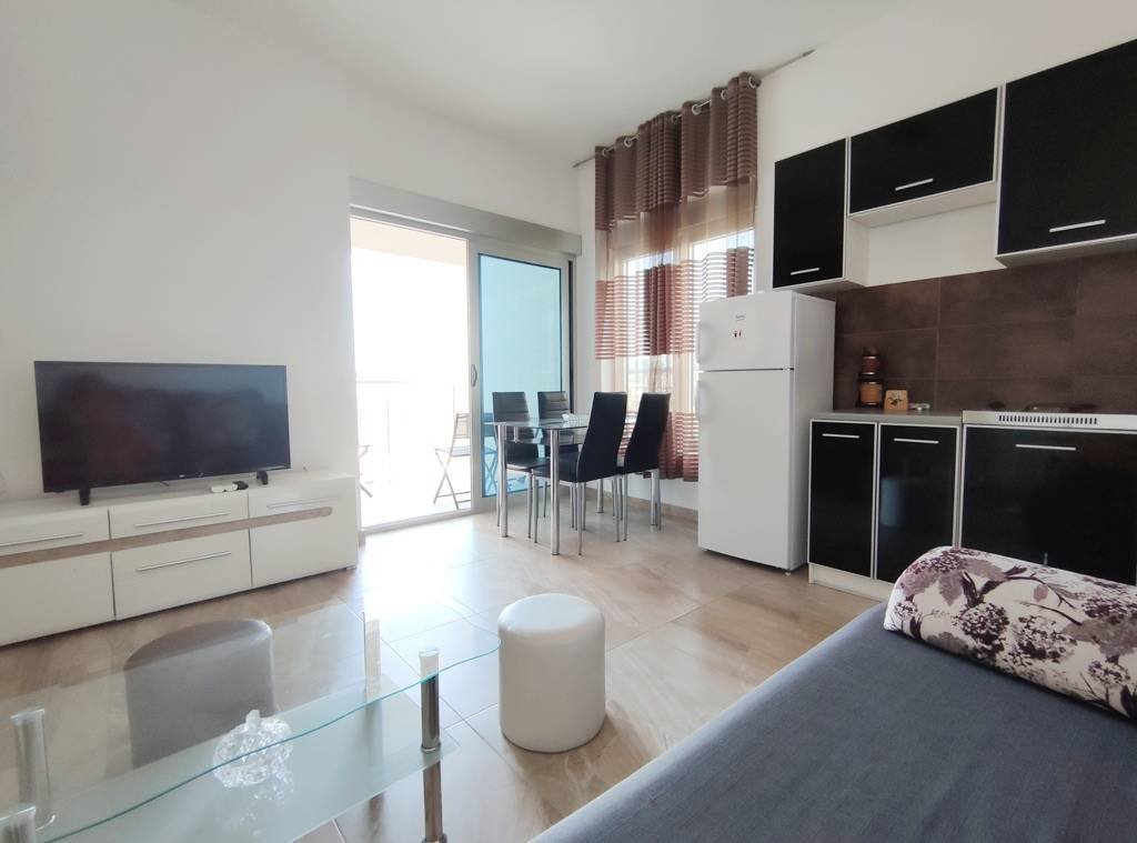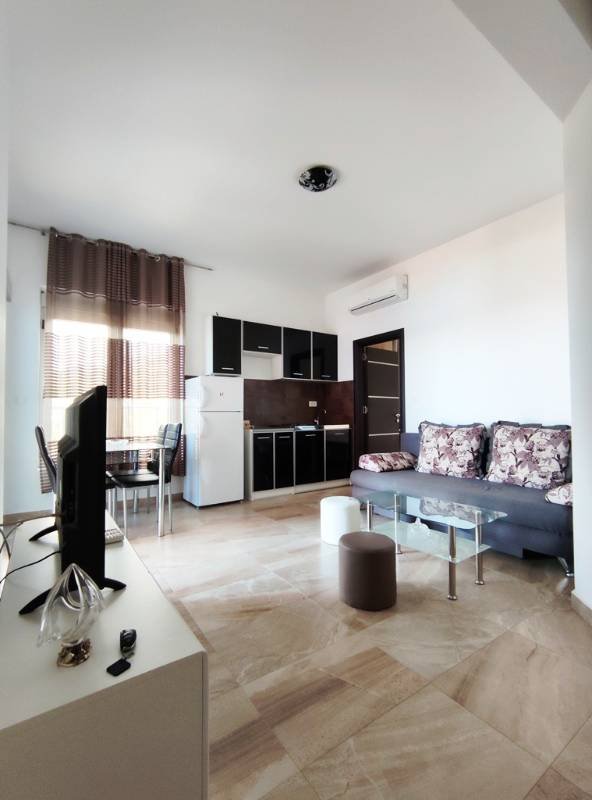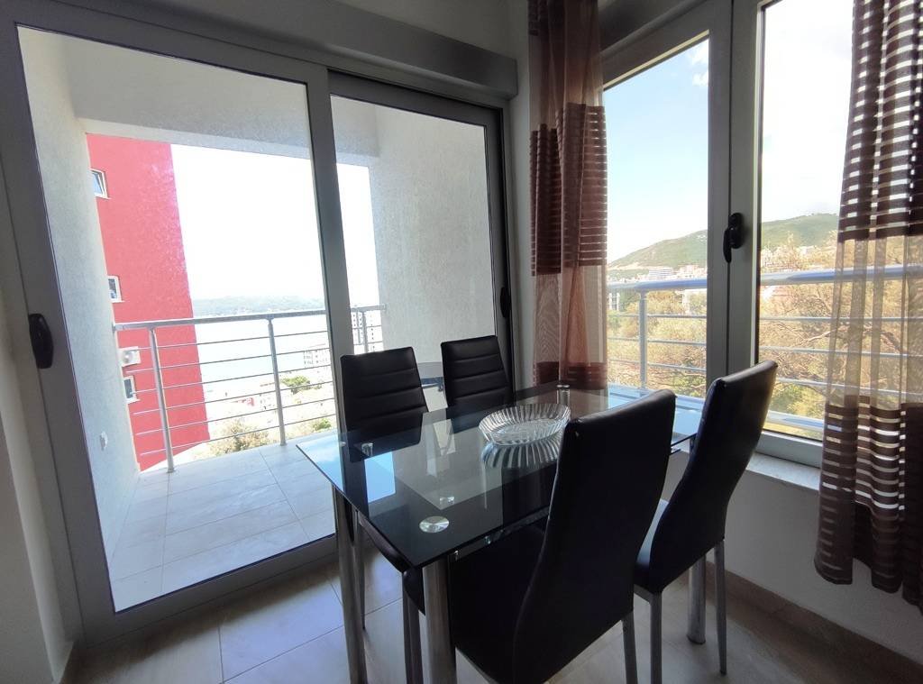 One bedroom apartment with sea views in Rafailovici The apartment is located in a new building, there is an elevator and a beautifully designed reception desk. The area of the apartment is 41m2: a corridor, a living room with a kitchen area, a bedroom, a balcony overlooking the sea, a bathroom. The apartment is fully furnished and equipped for living.