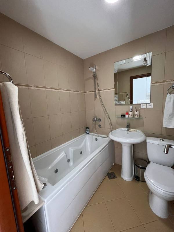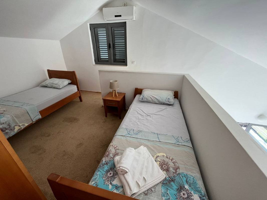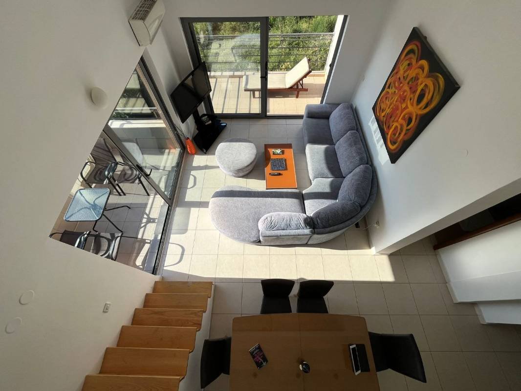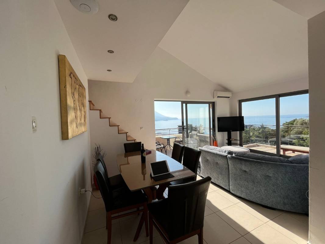 Two bedroom sea view apartment with gallery and two garage spaces in the Becici Sunset complex for sale. Furnished apartment with an area of 75 m2, located on 4 floors and with a direct view of the sea. It consists of: a large living room with a view of the sea and panoramic windows, two bedrooms and a gallery with two bedrooms, a bathroom, a kitchen, a terrace with a view of the sea, a corridor, two garage spaces and a storage room. 800m to the sea.