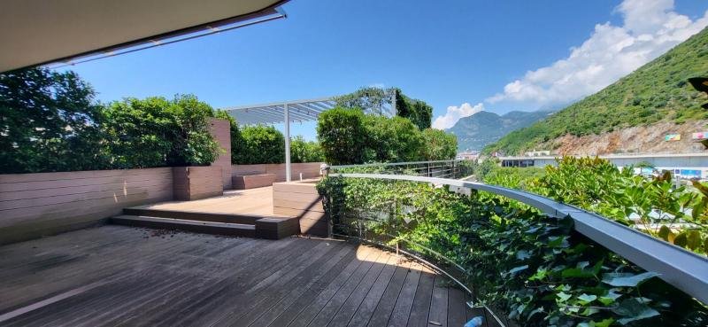 Villa for sale with a huge panoramic terrace in the Dukley Gardens complex. The total area is 284 m2. Area inside the villa: 155 m2, terrace area 129 m2. The villa is sold in the gray phase. Inside the villa, a summarized part of communications (water and electricity). The structure of the villa: a large living room with a kitchen and a panoramic view of the sea and mountains, two bedrooms, two bathrooms, a huge panoramic terrace with a jacuzzi and a view of the sea, the complex and Budva. It is possible to buy a parking space separately.