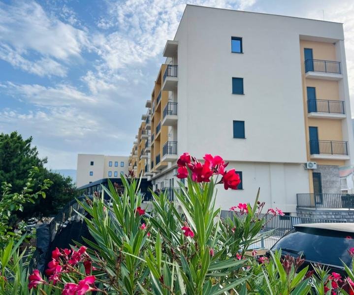 One bedroom apartment with sea views in Rafailovici The apartment is located in a new building, there is an elevator and a beautifully designed reception desk. The area of the apartment is 41m2: a corridor, a living room with a kitchen area, a bedroom, a balcony overlooking the sea, a bathroom. The apartment is fully furnished and equipped for living.
