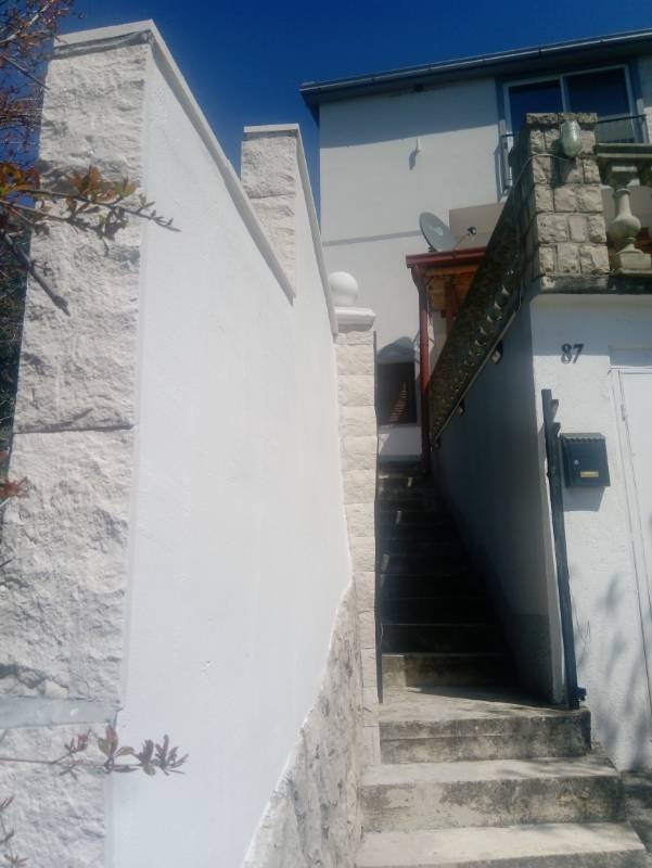 Od 6. maja 2026. godine izdaje se porodična kuća u Dobroj Vodi na period od jedne godine. Kuća ima panoramski pogled na more sa svih spratova i iz svih prostorija. Sastoji se od suterena, prizemlja i sprata. Prizemlje se sastoji od dvije spavaće sobe sa klimom (svaka sa bračnim krevetom), dnevnog boravka sa ugaonom garniturom i dodatnim kaučem, kupatila. Na prizemlju se nalaze kuhinja, velika terasa sa roštiljem i dodatni toalet. Dostupni su TV sa kablovskom televizijom i Wi-Fi internet. Apartman na spratu (potpuno odvojen) ima potpuno opremljenu kuhinju sa trpezarijskim i dnevnim dijelom sa rasklopivim kaučem, spavaću sobu sa velikim bračnim krevetom, klima-uređaj, kablovsku televiziju, Wi-Fi internet, poseban ulaz i zasebnu terasu. Gostima su u cijeloj kući na raspolaganju: 2 odvojena apartmana, prostrano dvorište, terasa sa otvorenim kaminom-roštiljem, privatni parking i garaža ispred kuće. Kuća je izolovana, ograđena i pruža mir i komfor neophodan za privatnost i kvalitetan boravak. Ukupna površina placa je 500 m², dvorište je puno zelenila i južnog voća. Udaljenost od mora je 250 m pješke, odnosno 147 m vazdušnom linijom (Google mjerenje). Do naselja Veliki Pijesak ima 1.300 m, gdje se nalaze restorani, prodavnice i drugi turistički sadržaji. Najbliži restoran je na 500 m, a prodavnica na 1.000 m. Cijena zakupa cijele kuće (150 m² stambene površine) na godišnjem nivou iznosi 900 € mjesečno. Postoji i mogućnost zakupa samo donjeg dijela kuće (115 m²) sa dvorištem, velikom terasom i parkingom, koji predstavlja zasebnu cjelinu. Cijena po dogovoru.