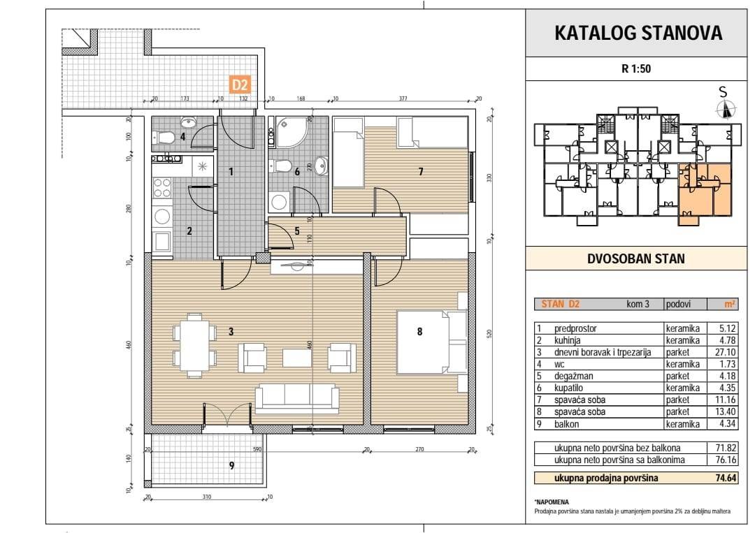 Na prodaju dvosoban stan u zgradi u izgradnji u Petrovcu sa pogledom na more! Rok za završetak objekta je 12.2025. Površine 76 m2, na kojoj se nalazi prostrani dnevni boravak, dvije spavaće sobe, kuhinja, kupatilo, toalet, ulazni hol i balkon. Stan će već biti u potpunosti završen, sa parketom i keramičkim podom. Trenutno su još dostupni sljedeći stanovi: Prizemlje - Garsonjera - 33,48 m2 - 75.500eur jednosoban stan 58,13 m2 - 131.000 eur 2 sprat - Garsonjera - 30,95 m2 - 70.000eur Odvojeno će biti moguća kupovina podzemnih parking mjesta u zavisnosti od površine od 12-16,6 m2, cijena će biti 12.000-17.000 eura.