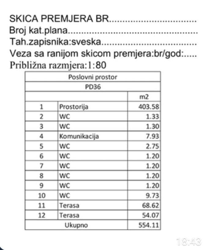 Poslovni prostor 554 m2 i 10 parking mjesta pored Mega Mall-a u Budvi! Površine 554 m2 od čega prostor 403,5 m2, 2 otvorene terase 124 m3, 26 m2 kupatila i komunikacije, parking sa ogradom za 10 automobila. Soba ima grubu završnu obradu i nikada prije nije korištena. Ima panoramsko zastakljivanje duž cijelog perimetra. Smješten na odličnoj lokaciji pored Mega Mall-a, Tehnomax trgovine i fontane.