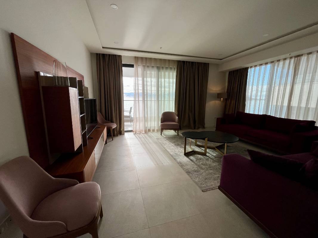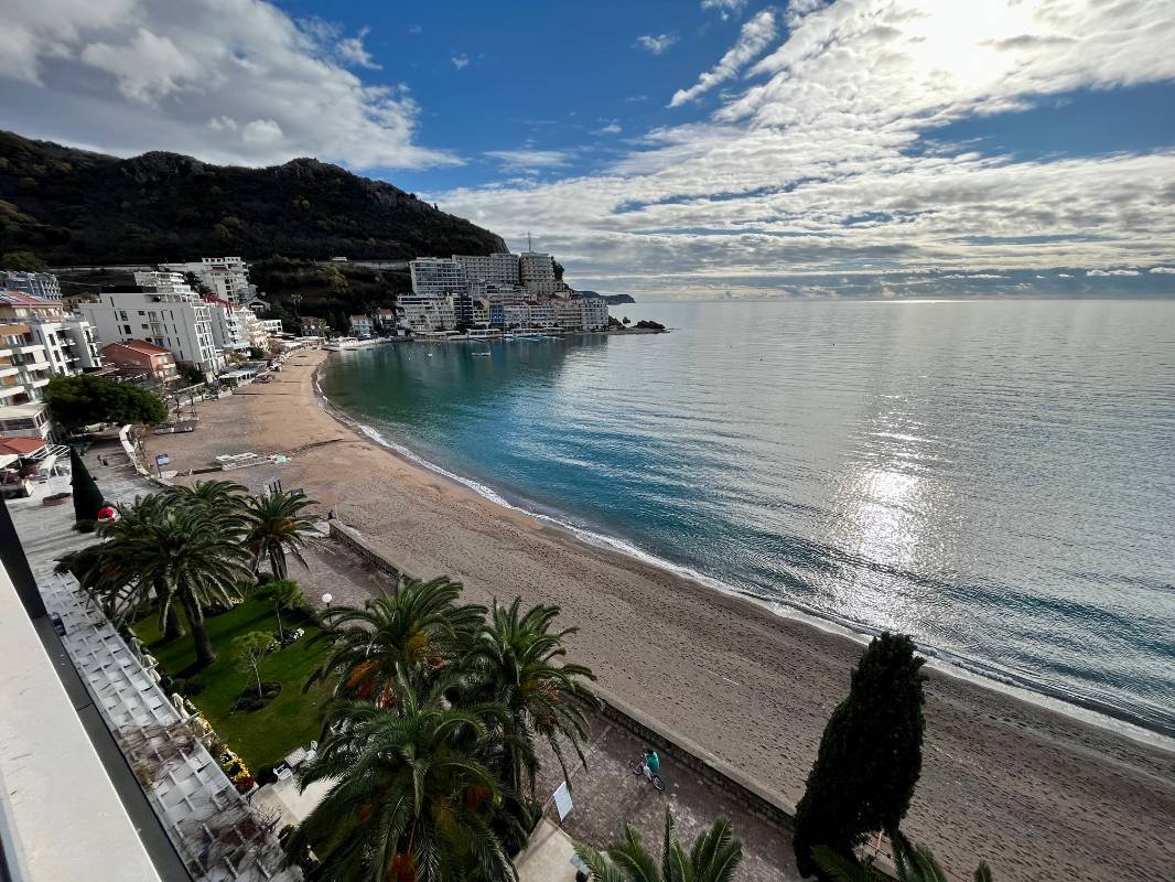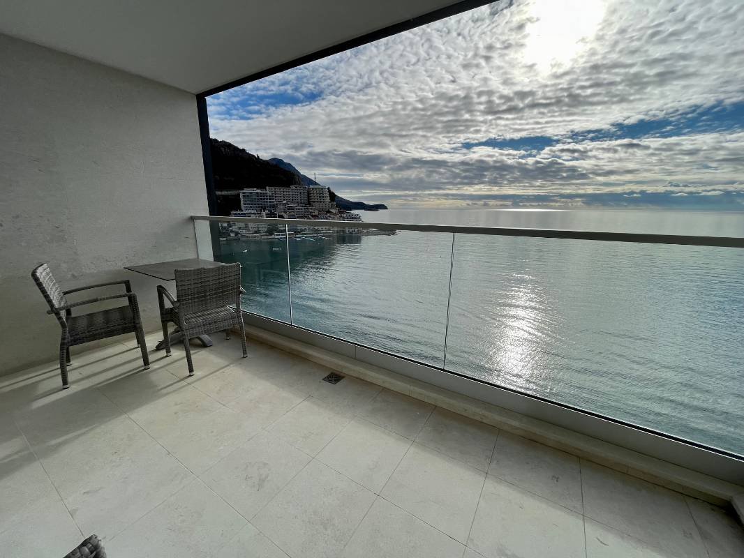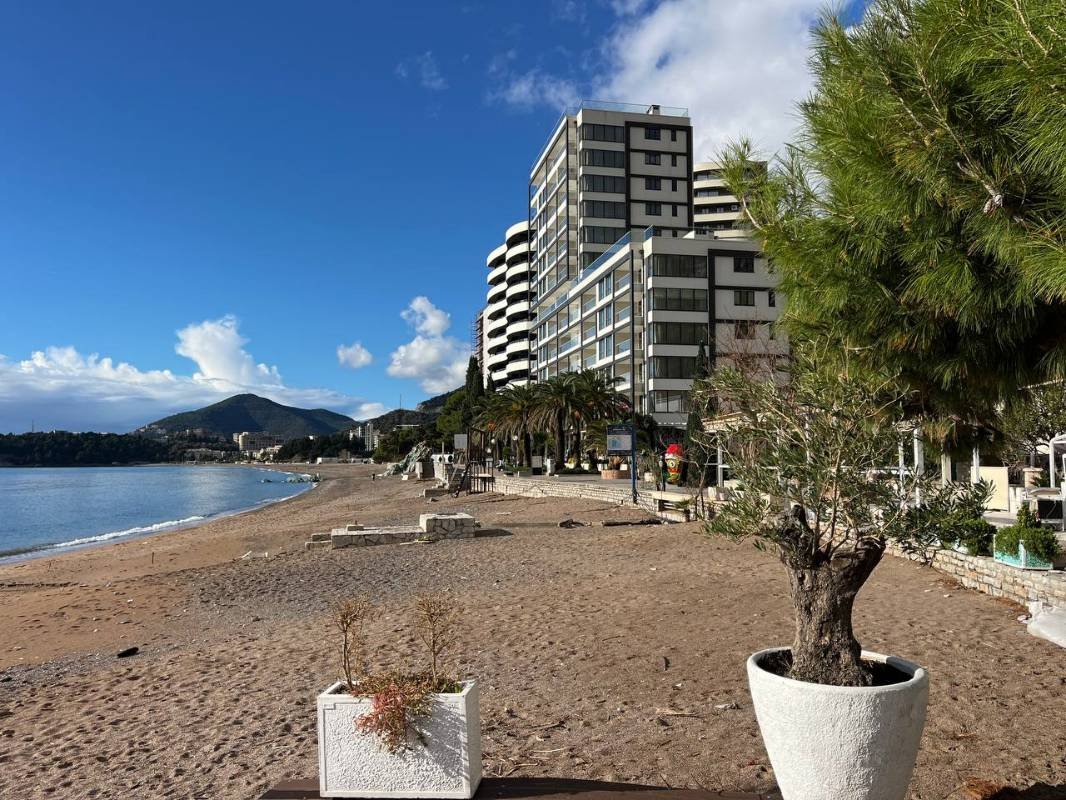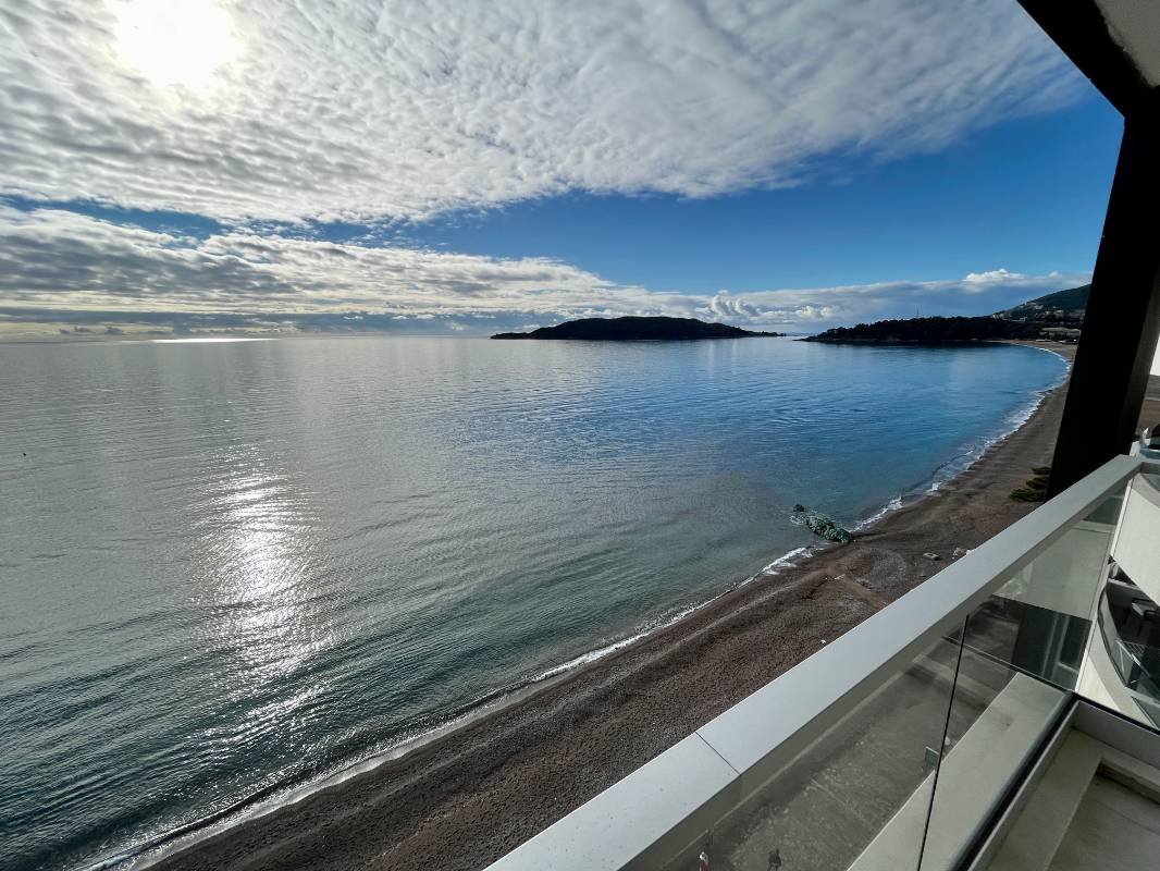 Dvosoban stan na prvoj liniji mora! Snižena cijena samo do kraja godine! Površine 110 m2 sastoji se od dnevnog boravka, kuhinje blagovaone, 2 spavaće sobe, 2 kupaonice, garderobe, terase sa panoramskim pogledom na more! Kompletno namješten modernim namještajem i Bosh kućanskim aparatima, grijani podovi u kupatilu, ostava na terasi. Smješten na prvoj liniji bečićkog nasipa u mjestu Rafailovići, u modernom kompleksu sa internacionalnim restoranima.