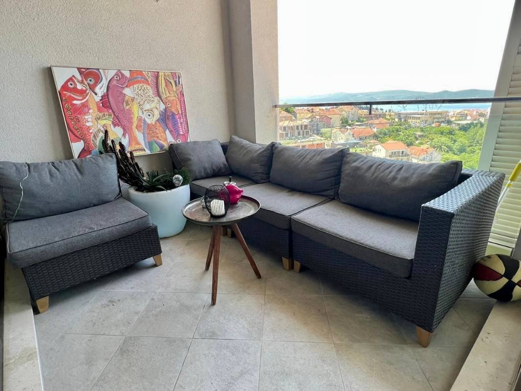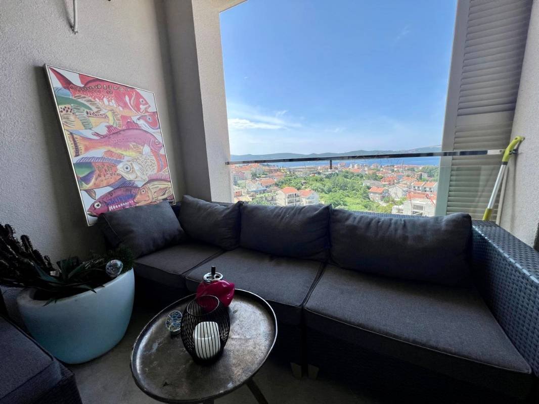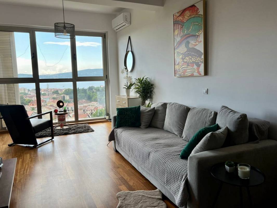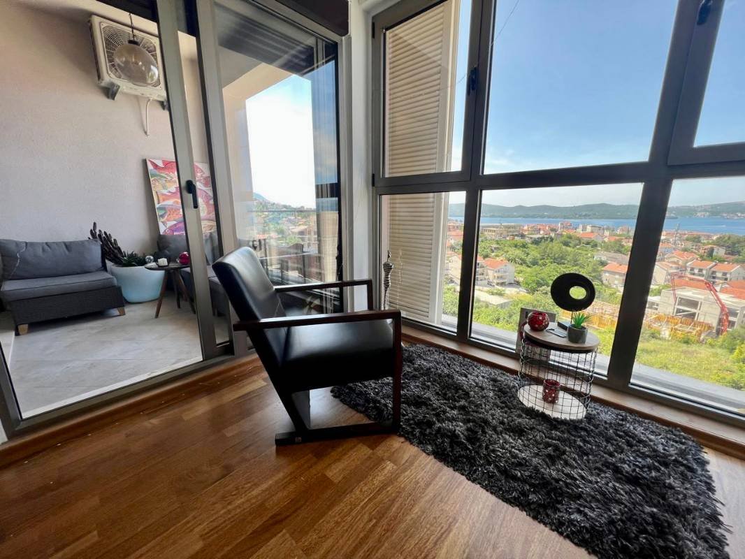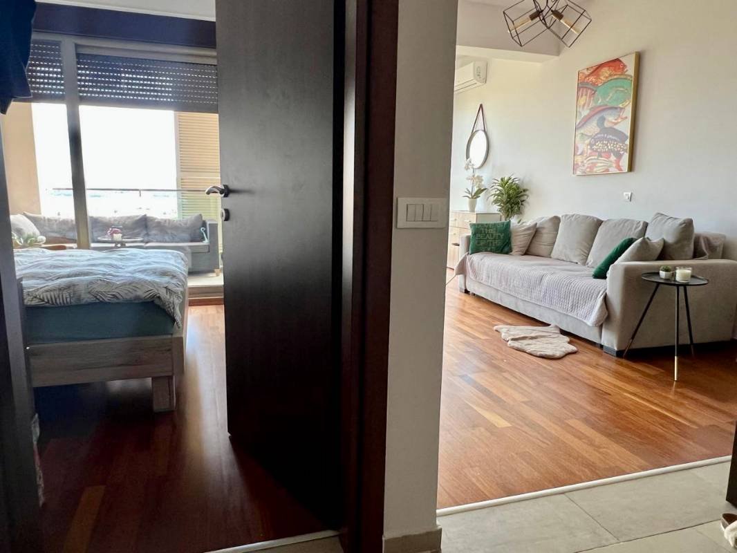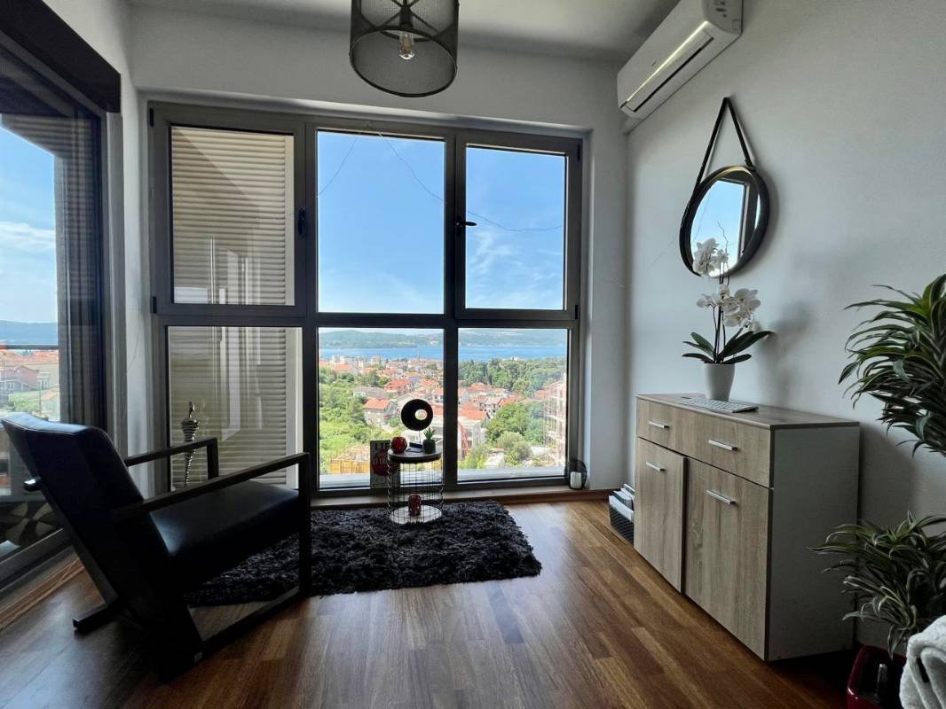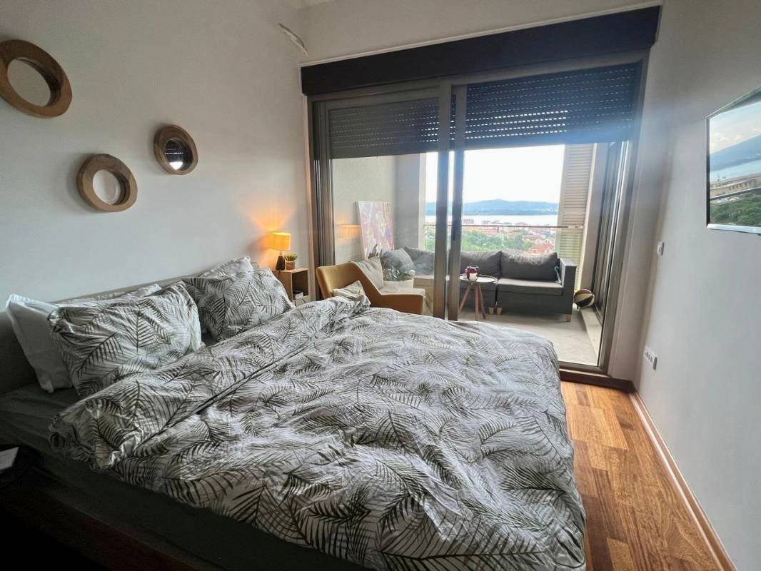 Jednosoban stan sa garažom i bazenom u Tivtu! Površine 56 m2 (prema dokumentima 47 m2) sastoji se od dnevnog boravka sa kuhinjom, spavaće sobe, kupatila, balkona sa pogledom na more i parkinga u garaži. Opremljen modernim nameštajem po veličini i aparatima, panoramsko zastakljivanje, parket, južna orijentacija, osvetljen bazen, sa liftom, Kvalitetna zgrada je obložena mermernim kamenom, ima parking mesta u blizini zgrade, a u garaži postoji i privatni parking.
