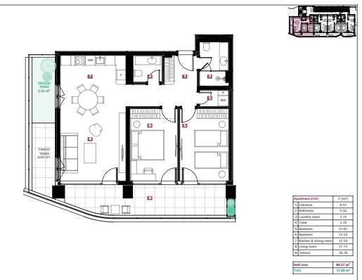 Prostran trosoban stan u modernom i udobnom kompleksu Onia Hills u Reževićima, koji ima odličnu saobraćajnu povezanost i lak pristup Budvi i Svetom Stefanu, brojnim plažama u krugu od 3 km i tri međunarodna aerodroma u krugu od 80 km. Površine 90,27 m2 sadrži: ulaz, hodnik 9,12 m2, kupatilo 4,50 m2, toalet 2,78 m2, kuhinju i trpezariju 12,27 m2, dnevni boravak 17,74 m2, vešeraj 1,74 m2 i 2 spavaće sobe 172 m2 i terasu 2.5 m2. površine 16,78 m2. Stan je namješten i opremljen kućanskim aparatima, korištenjem najboljih savremenih materijala i visokokvalitetnih aparata. Stanovnici i gosti dobijaju besplatan pristup svim sadržajima odmarališta: teretani, zatvorenom spa centru sa saunom, bazenom i đakuzijem, 3 vanjska bazena kao i infinity bazen na krovu sa panoramskim pogledom, dečiji klub, dečiji bazen, prostori za opuštanje. U okviru objekta nalaze se restoran i prodavnica koja radi non-stop. Onia Hills kombinuje eleganciju, udobnost i praktičnost, nudeći zaista nenadmašnu priliku za luksuzan život i pametno ulaganje na jednom od najbrže rastućih tržišta nekretnina u Evropi. Moguća kupovina garaže u donjem spratu zgrade.