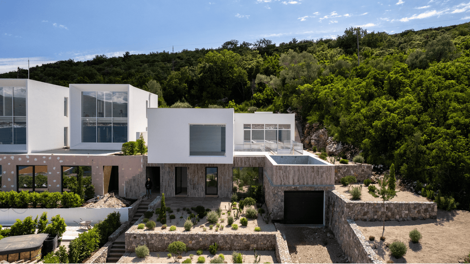 Moderna vila sa panoramskim pogledom na more u Krašićima. Nova vila se nalazi u jednom od najljepših i najmirnijih dijelova obale, na svega nekoliko minuta hoda od plaže. Iz vile se pruža panoramski, trajno otvoren pogled na Jadransko more. Površina vile iznosi 328 m², dok je površina placa 680 m². Na imanju se nalaze privatni bazen, prostrana veranda sa pogledom na zaliv, kao i garaža sa praktičnim prilazom. Vila je opremljena sistemom podnog grijanja i sopstvenom kotlarnicom, a korišćeni su kvalitetni materijali i sanitarije evropskih proizvođača. Raspored vile pažljivo je osmišljen i izdvaja se od standardnih rješenja u Crnoj Gori. Prizemlje: prostran ulazni hol, svijetao dnevni boravak sa panoramskim staklenim površinama povezan sa kuhinjom i trpezarijom, dvije odvojene spavaće sobe sa sopstvenim kupatilima i kuhinjama, kupatilo, vešeraj i kotlarnica. Sprat: tri spavaće sobe, tri kupatila, tri garderobne sobe, ostava, velika veranda sa pogledom na more i bazen. Vila je idealna za udoban život, odmor ili investiciju, nudeći visok nivo privatnosti, komfora i rijetka arhitektonska rješenja za ovaj region.