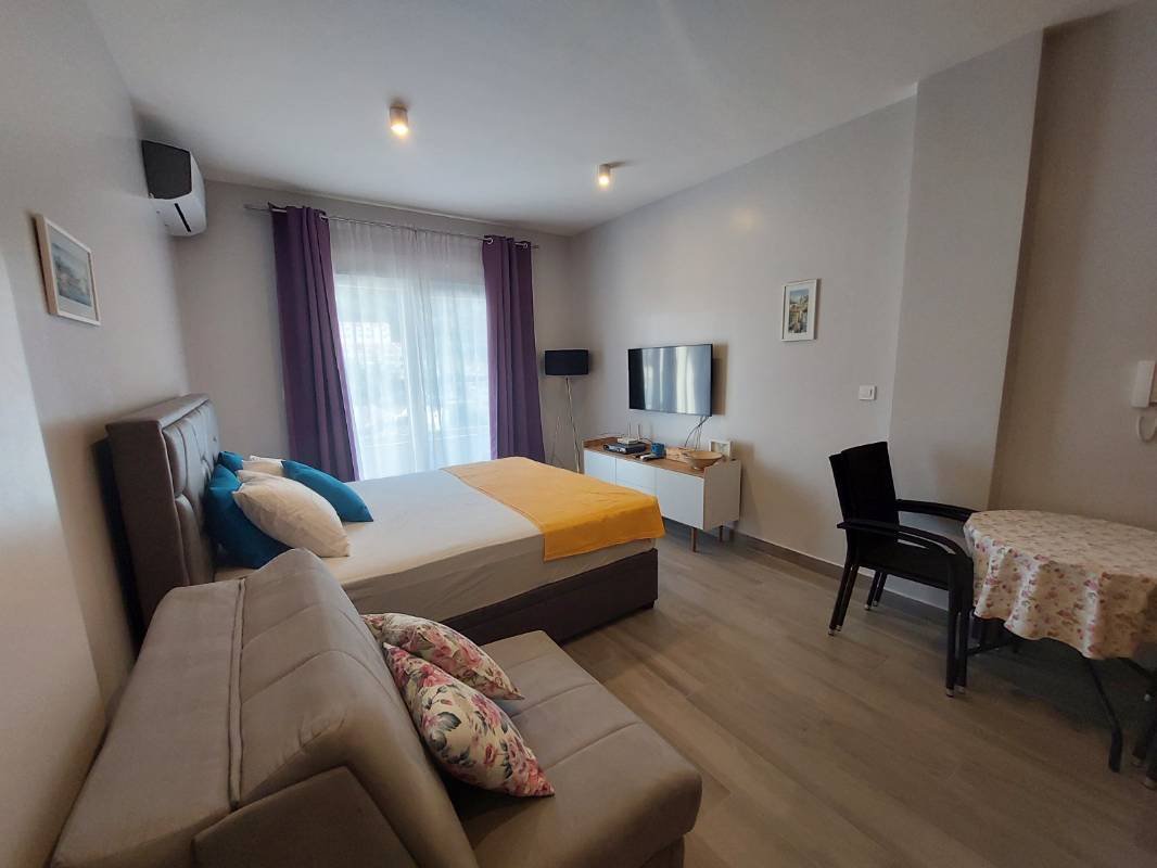 Светлая и уютная квартира площадью 43 м² в самом центре Будвы - всего 600 метров до моря! Отдельная спальня, просторная гостиная с кухней open-space и солнечная терраса, где можно отдыхать в любое время дня. Долгосрочная аренда — на год.