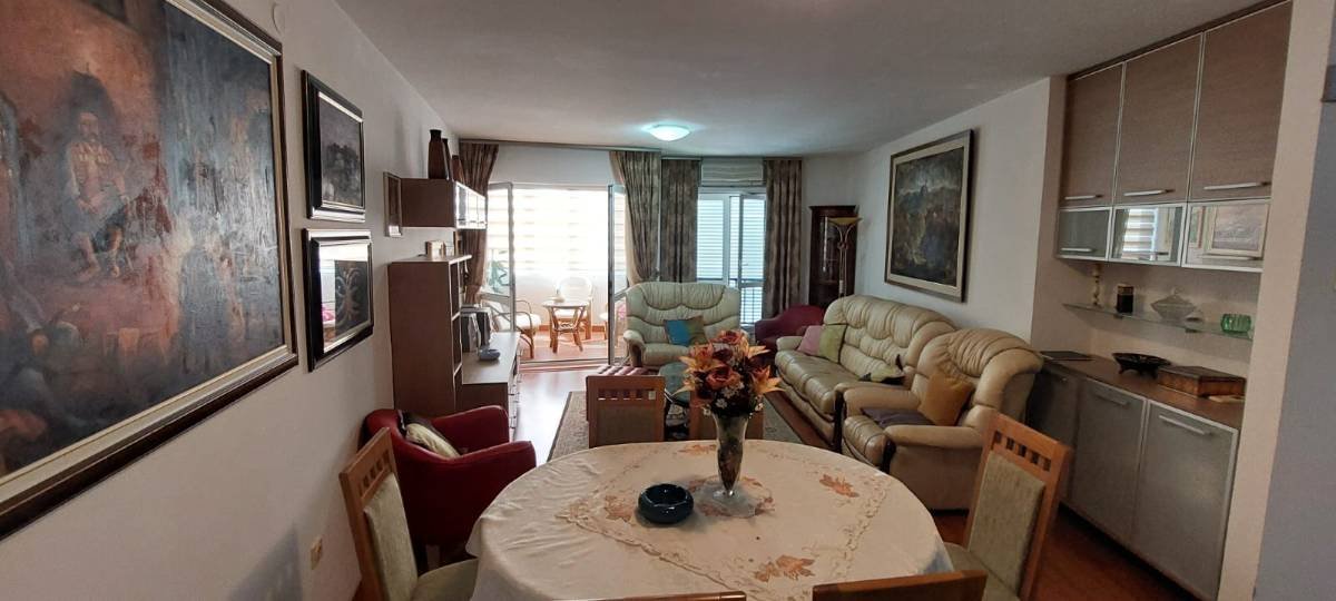 Продается трехспальная квартира в Будве в районе Адок, Подкошлюн. Площадь 100 м2, на которых расположилась просторная гостиная с кухней, две спальни, рабочий кабинет, две ванны, две террасы.Квартира меблирована, установлена вся необходимая техника. Встроенная мебель высокого качества производства Sogal (кухня, шкафы-купе на заказ в комнатах, большой шкаф в коридоре и полки в гостиной), в комнатах установлена мебель из массива дерева. До моря пешком минут 10. Рядом полно магазинов, кафе, ресторанов и булочных.