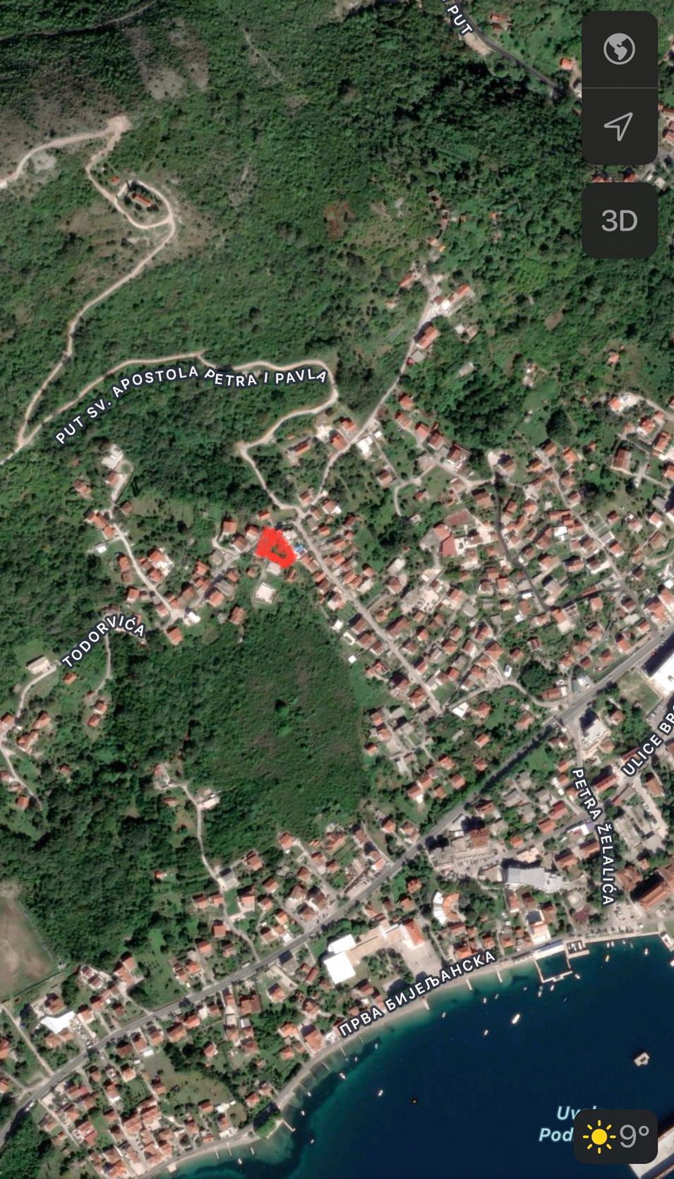Продается земельный участок площадью 380 квадратных метров в Биеле (Герцег Нови). Есть разрешение на строительство, подключена вода и электричество. Расположен рядом с магистралью, на участке начато строительство здания. Красивый вид на море, расстояние до моря 400 метров.